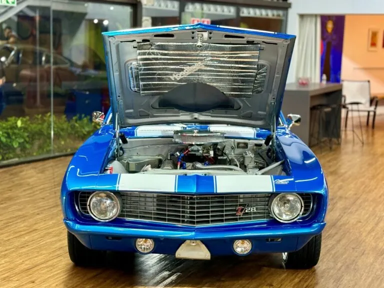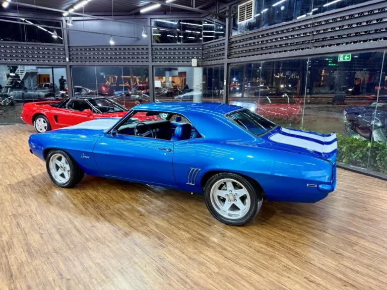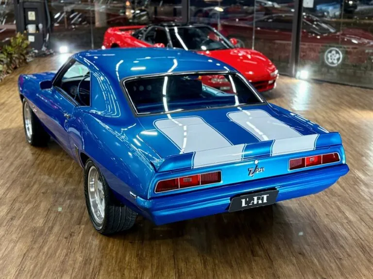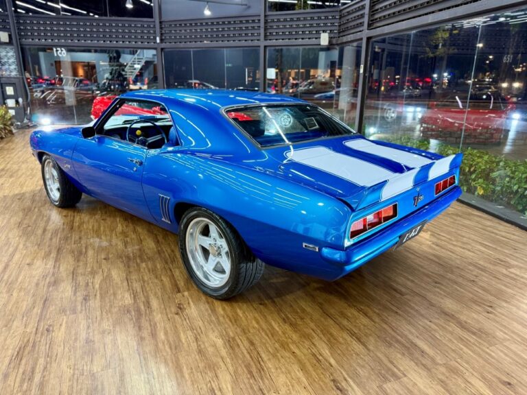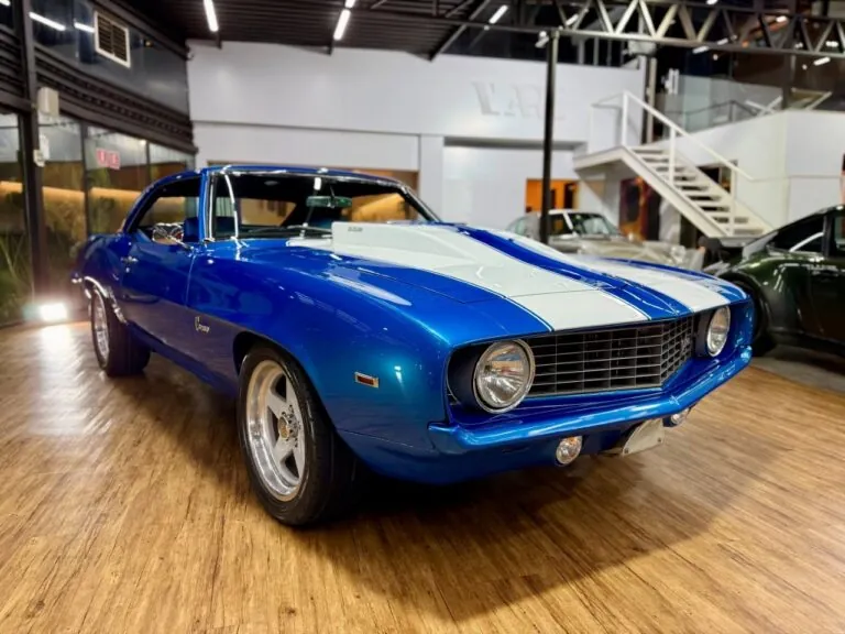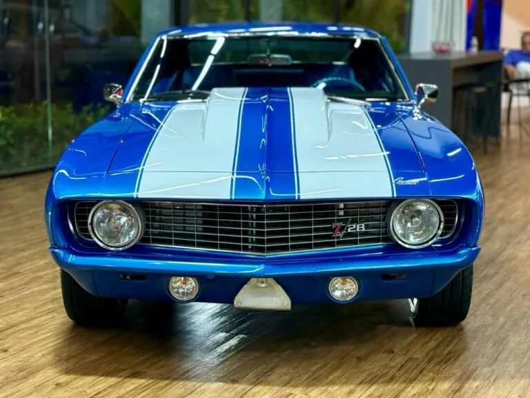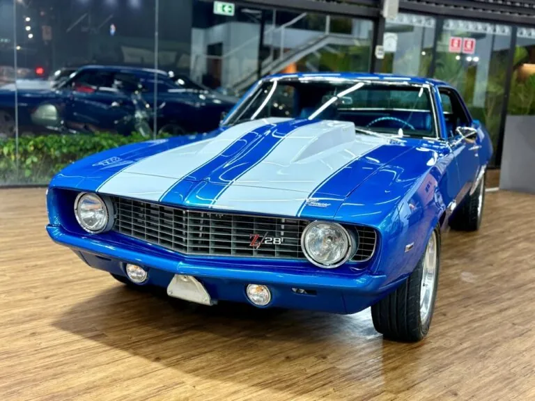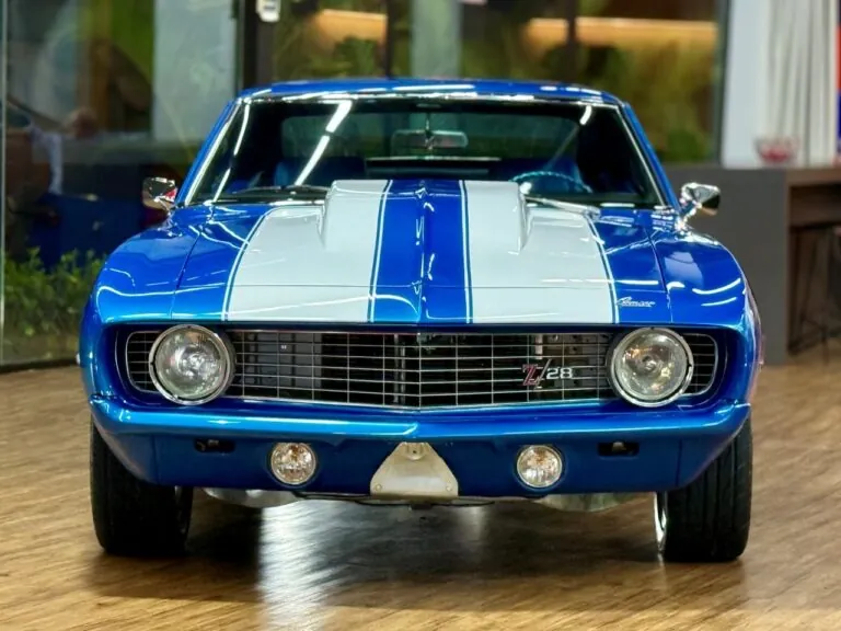 Um ícone das pistas, equipado com o raríssimo motor V8 302. O Camaro Z/28 1969 é a versão de alto desempenho da primeira geração, criado para homologação na classe Trans-Am da SCCA, onde obteve muito sucesso, com o modelo conquistando os campeonatos de 1968 e 1969. Tinha potência anunciada de 290 cv, mas na prática podia passar de 360 cv com o carburador original e mais de 400 cv com upgrades raros. Disponível apenas como coupé, vinha com câmbio manual de 4 marchas, além de suspensão reforçada para desempenho e dirigibilidade superiores. Muitos vinham com o pacote visual RS e as icônicas duas faixas de corrida. Nosso Camaro está simplesmente maravilhoso!