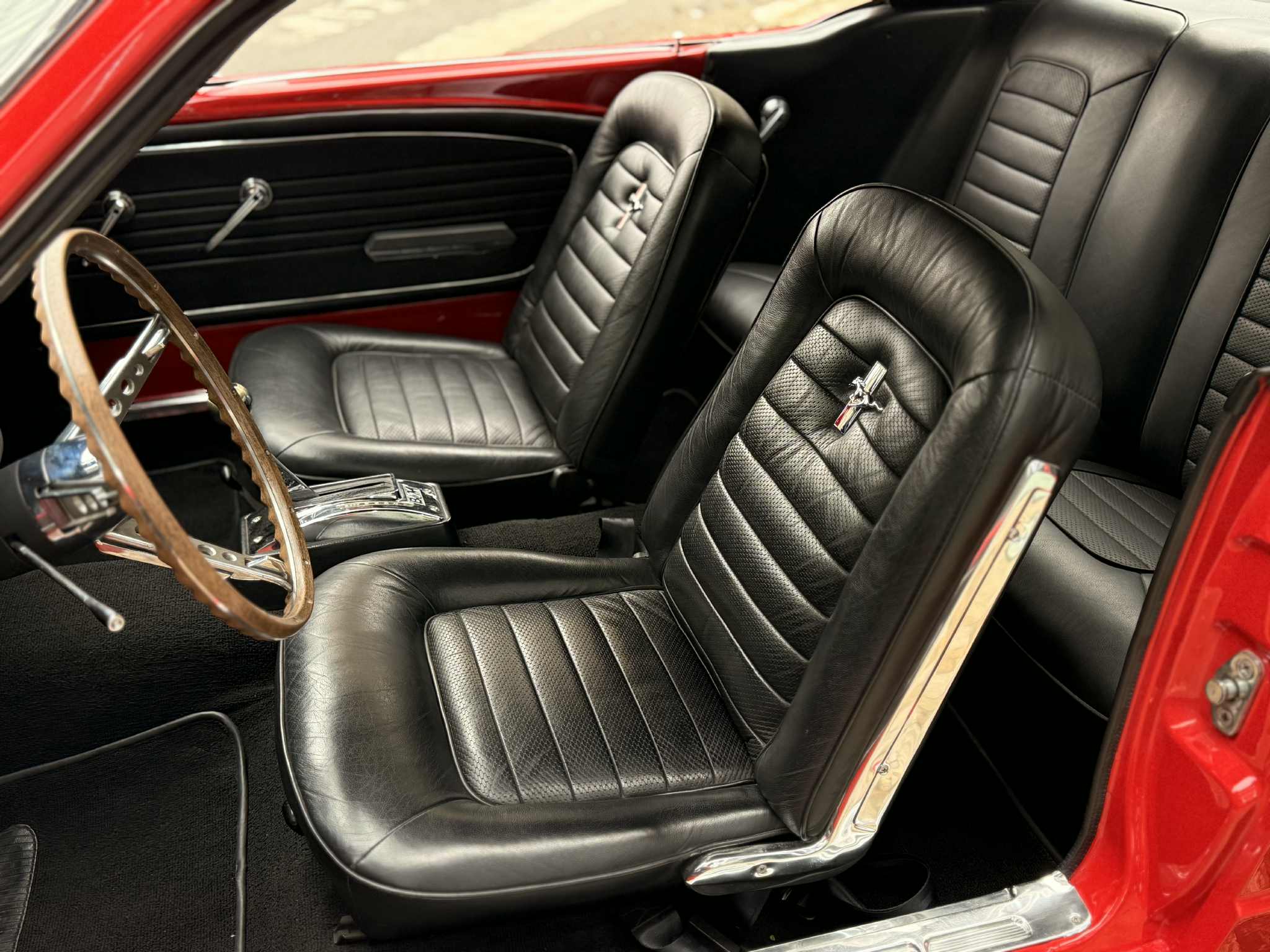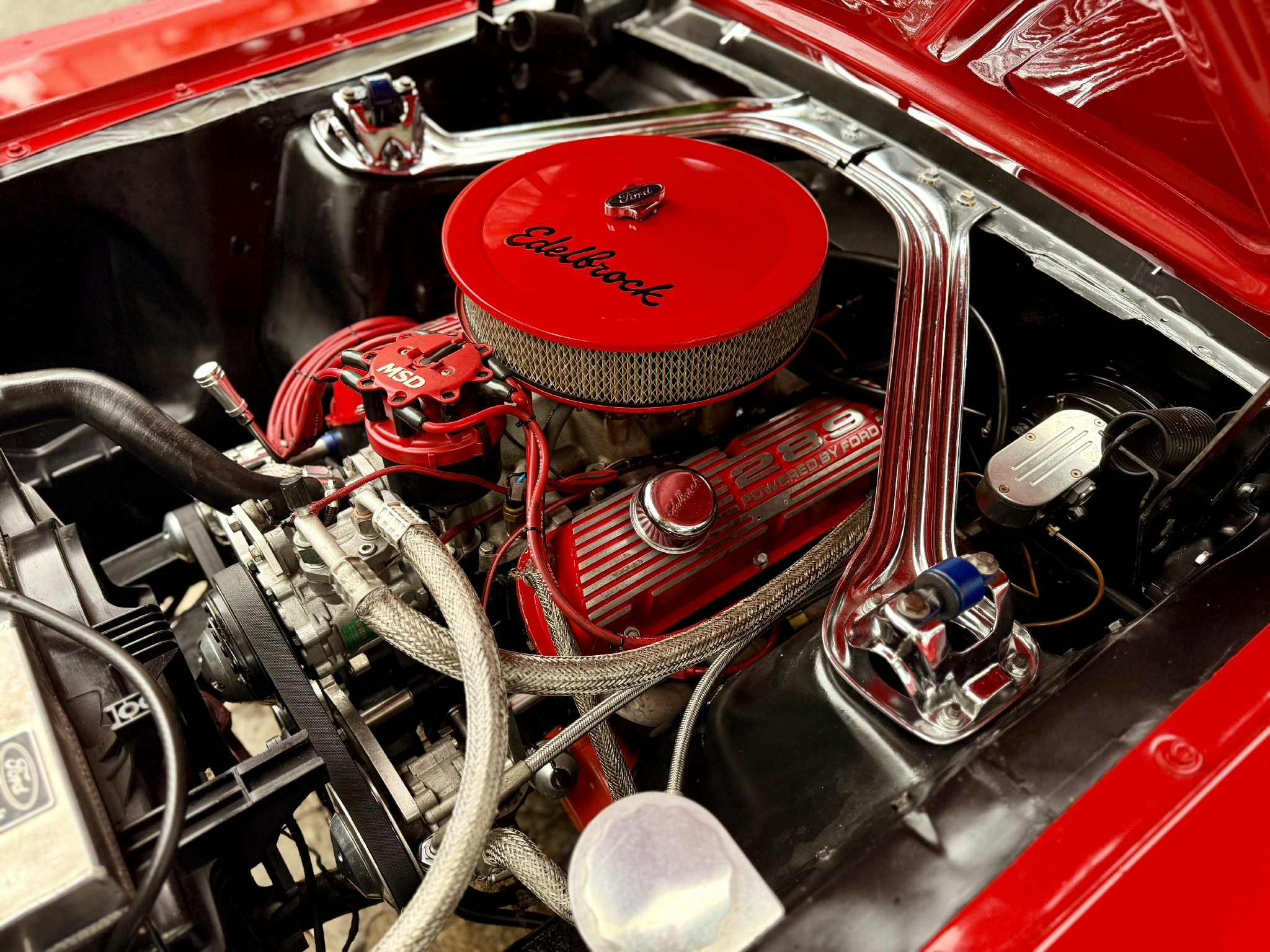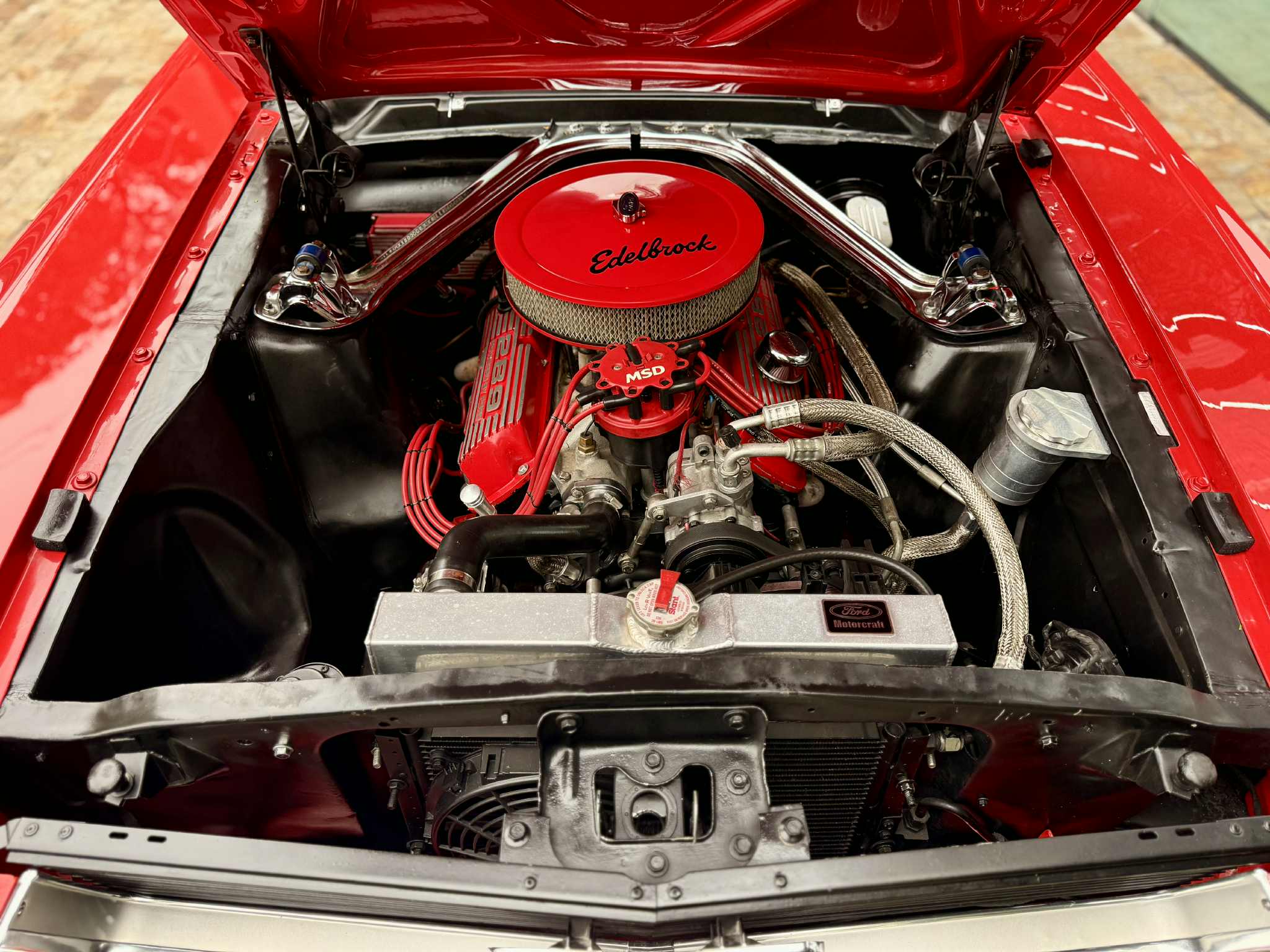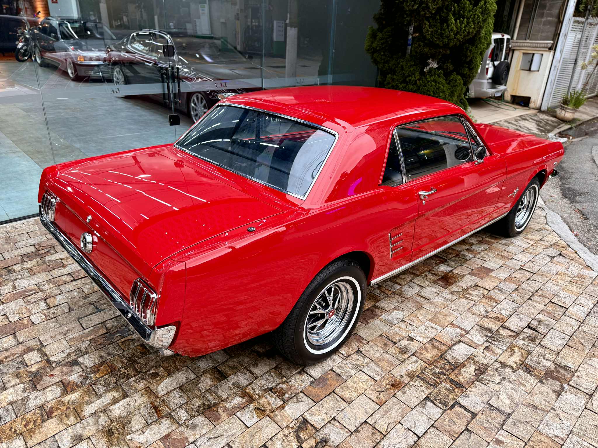 Na linda cor vermelha com interior em couro preto, nosso Mustang Hard Top está simplesmente maravilhoso! Motor V8 - 289 com aproximadamente 200 CV. Possui ar condicionado, direção hidráulica, ventoinha elétrica, radiador em alumínio, sistema de correia Poly-V e distribuidor MSD. O Mustang é sem dúvida um dos maiores sucessos da indústria automobilística, do ponto de vista comercial e representativo da cultura norte-americana em todo o mundo. Seu lançamento, em abril de 1964 no salão de Nova York, inaugurou uma nova era no mundo automotivo.