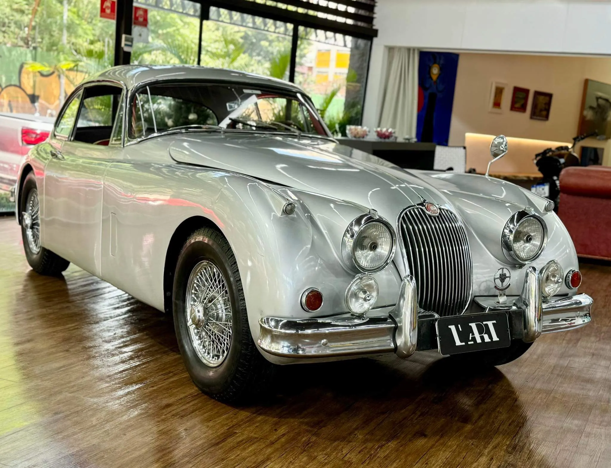 XK 120 e XK 140, por isso era bastante semelhante aos modelos mencionados, ainda que tenha sido aplicado um forte trabalho de modernização. Pára-brisa panorâmico em peça única, laterais da linha da cintura mais altas e a frente foi redesenhada e ficou mais inclinada e aerodinâmica. No interior, o painel de instrumentos foi substituído por um revestimento em couro. Esse Jaguar XK 150 é um S original, sendo um dos mais importantes da linha. Possui motor 6 cilindros em linha com duplo comando de válvulas no cabeçote e cabeçote modificado nessa linha S com 3 carburadores e 253 HP. Esse automóvel está muito íntegro, com o atual proprietário há 43 anos.