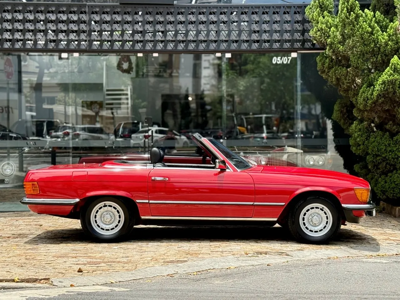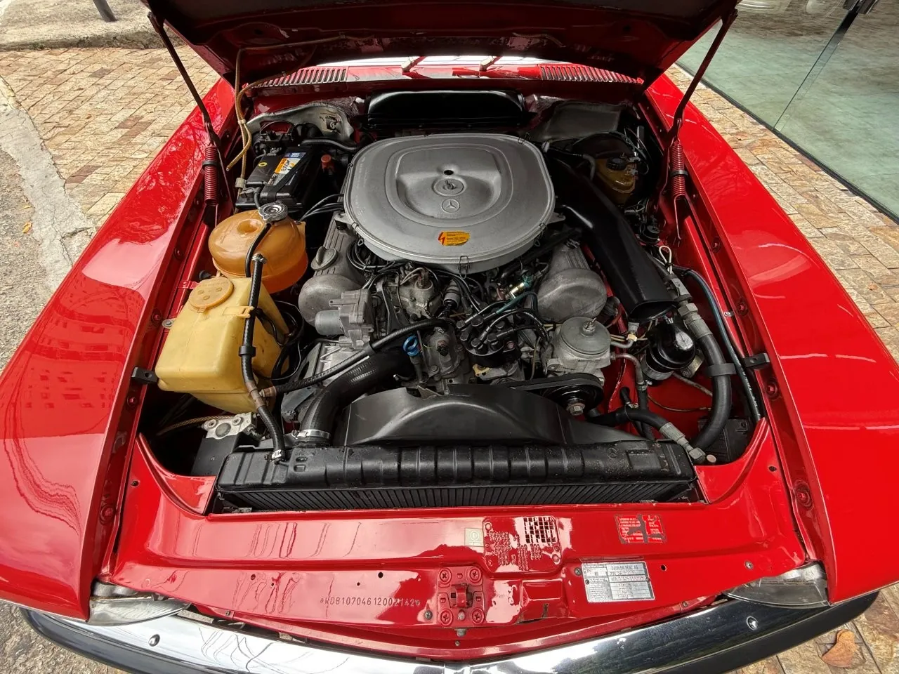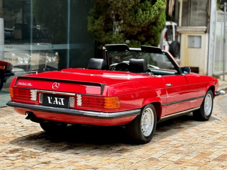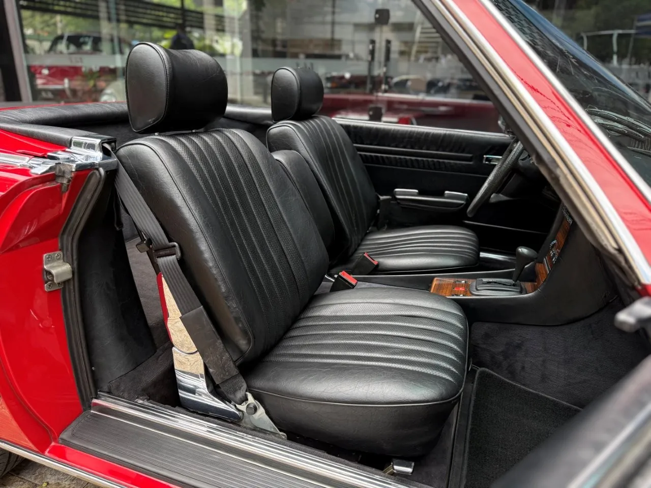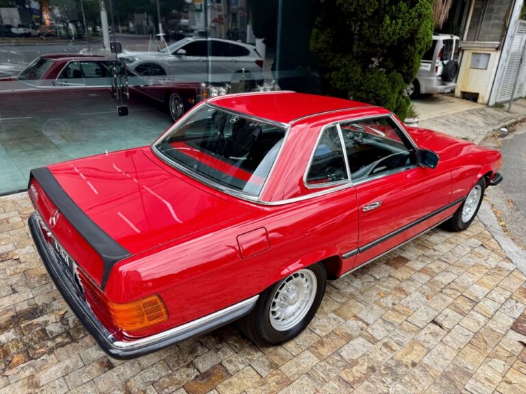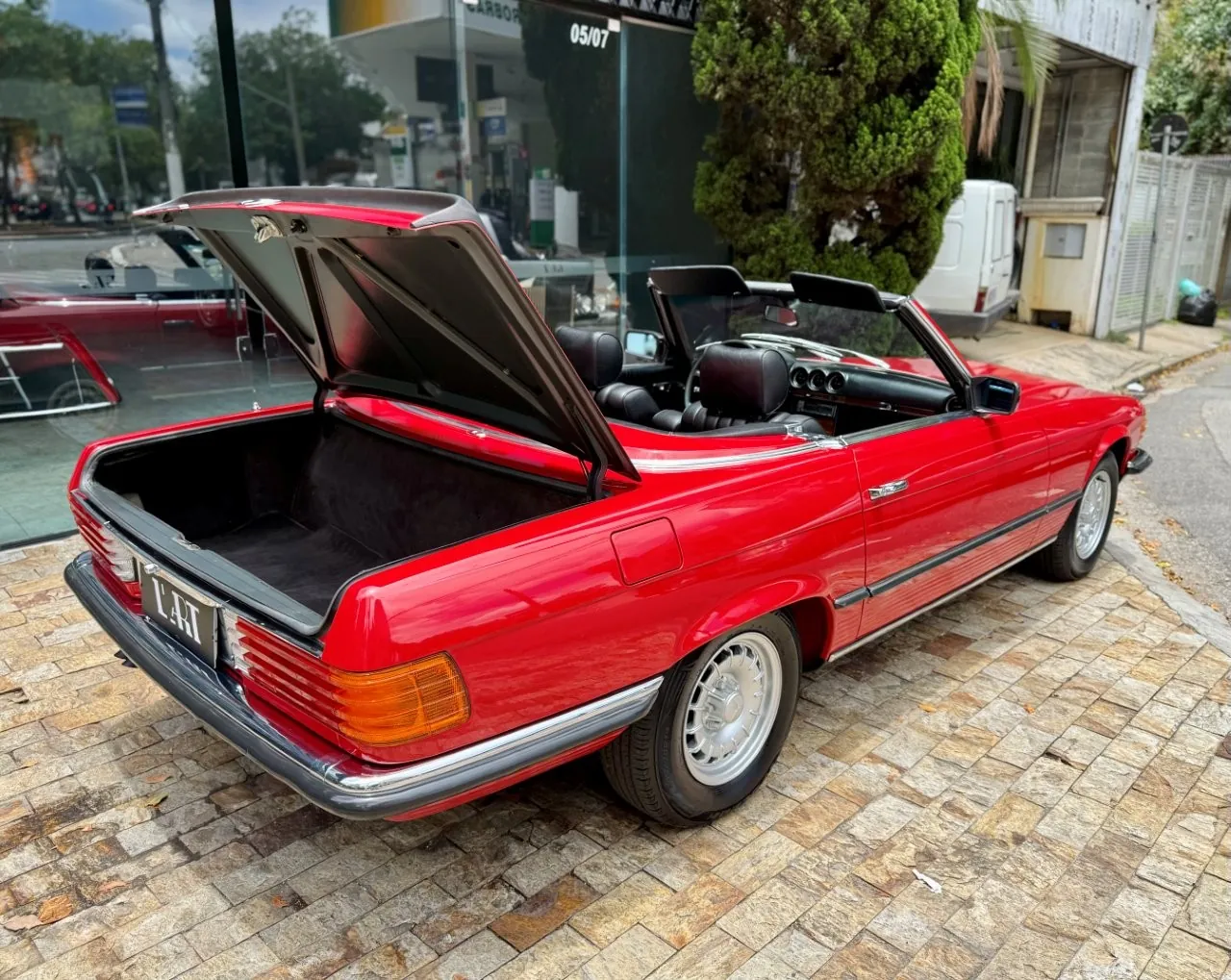 A Mercedes-Benz 500 SL 1982 é um dos roadsters mais marcantes da marca. O nome SL vem de "Sport Leicht" — Esporte Leve, e esse conceito aparece no carro todo. Ela vem com o V8 5.0 em alumínio, 230 cv, um motor conhecido pela força, suavidade e durabilidade. A combinação com o câmbio automático de 4 marchas e a tração traseira entrega exatamente aquilo que se espera de uma R107: acelera fácil, viaja macio e responde do jeito certo. Em curva, é um carro que surpreende pela estabilidade. Os freios a disco nas quatro rodas e as rodas de liga leve completam o conjunto. Essa 500 SL está em ótimo estado geral, alinhada, íntegra e com aquela presença clássica que só uma R107 bem cuidada tem.