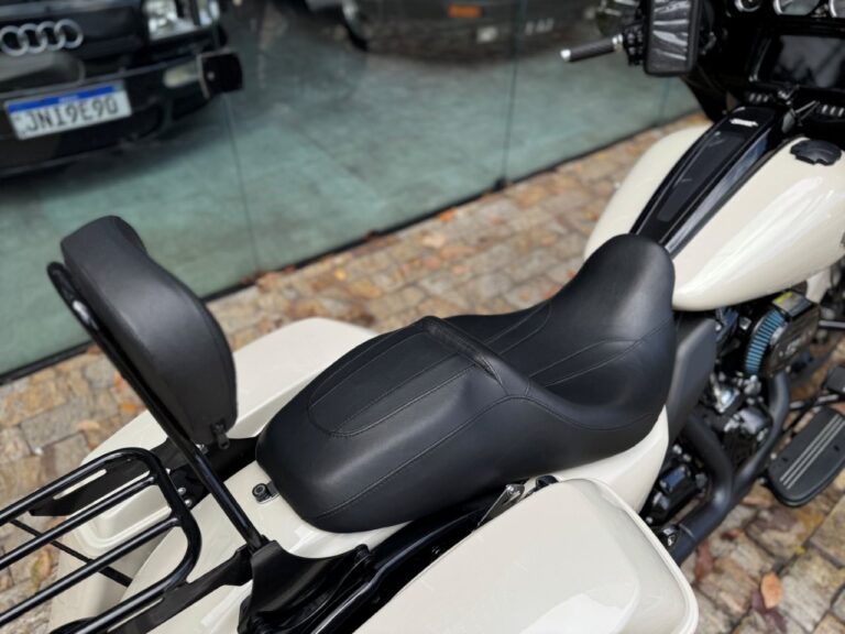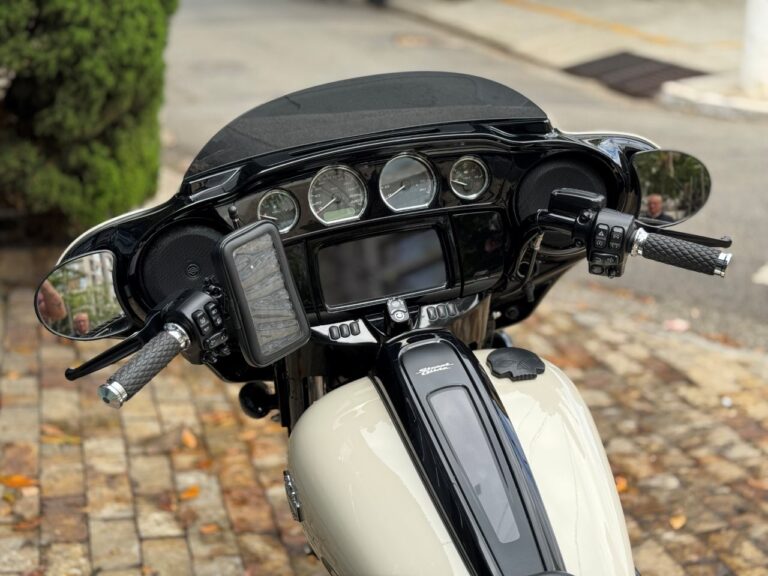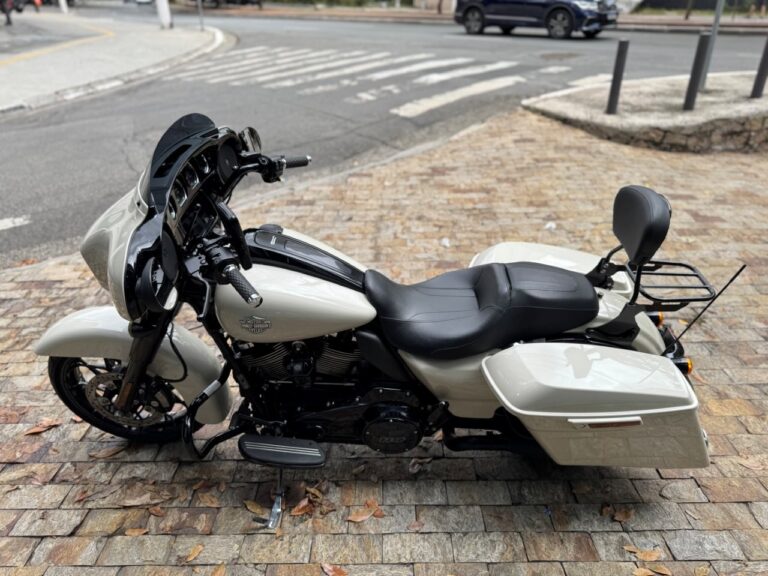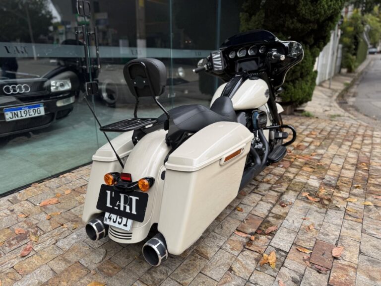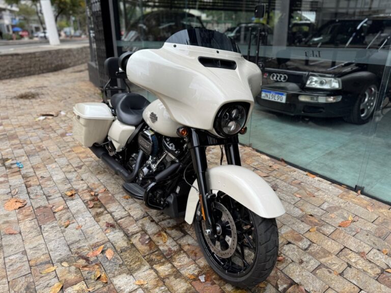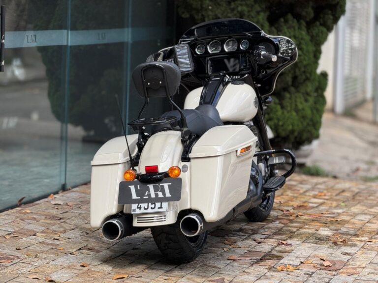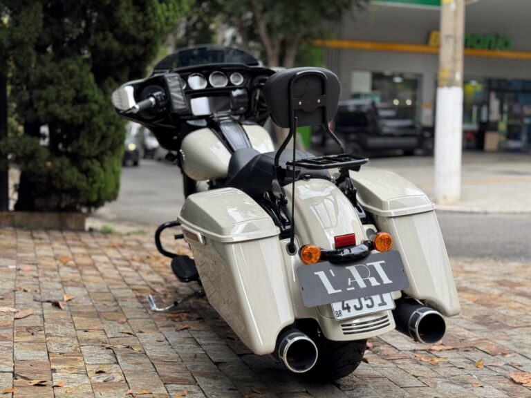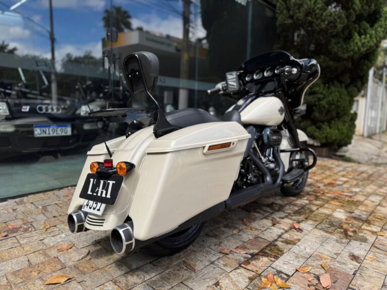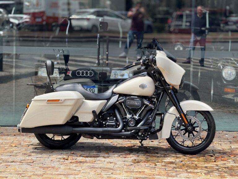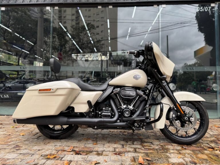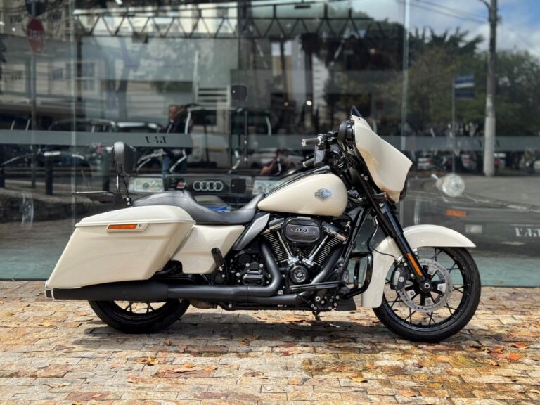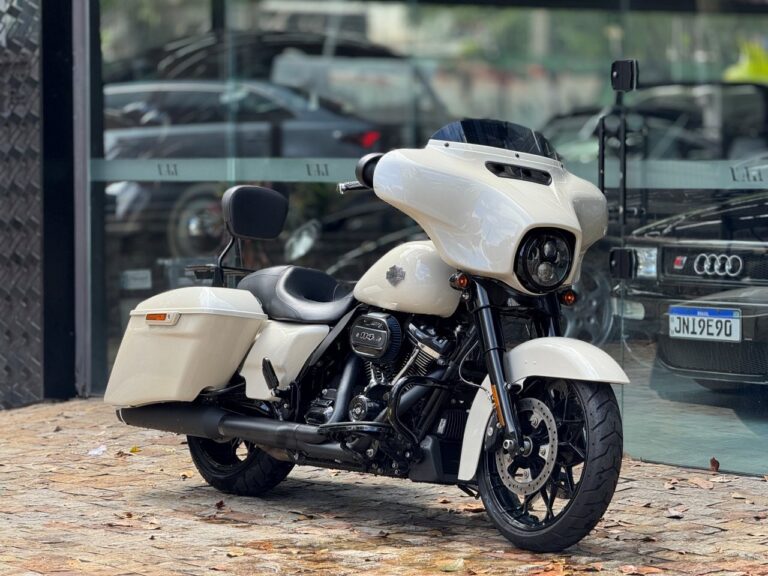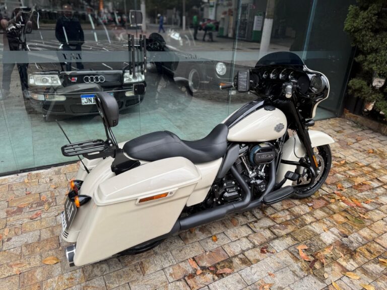 A Harley-Davidson Street Glide Special é uma moto clássica que une conforto e presença. Vem com motor Milwaukee-Eight 114 V-Twin de 1.868 cc, torque de 15,8 kgfm, câmbio de 6 marchas e transmissão por correia. Suspensão calibrada para estrada e cidade, rodas grandes e aerodinâmica de respeito. Por dentro, som Boom! Box com 4 alto-falantes, conectividade completa e tecnologia de segurança com ABS, controle de tração e torque. É aquela moto que impressiona na estrada, mas também é confortável para o dia a dia.