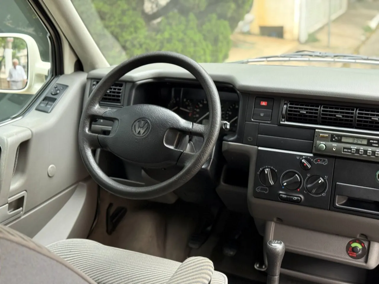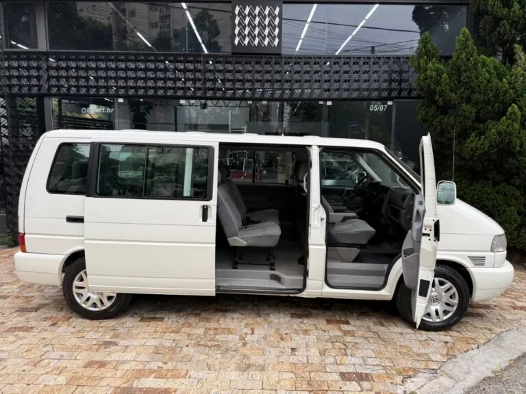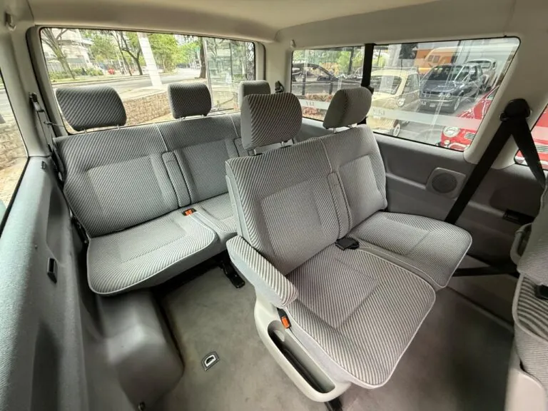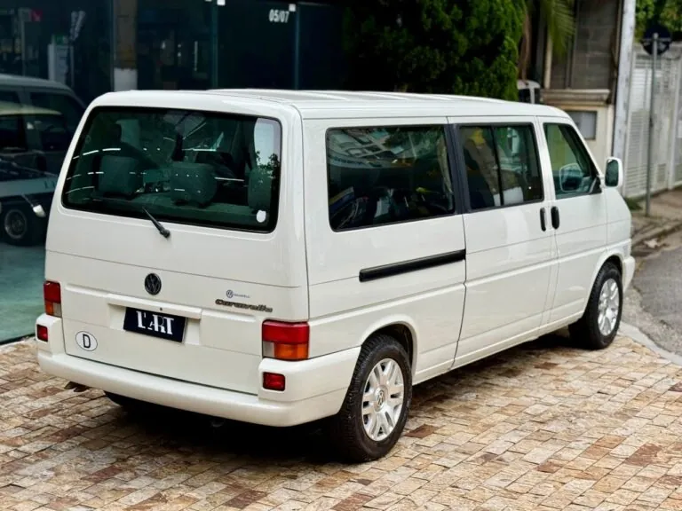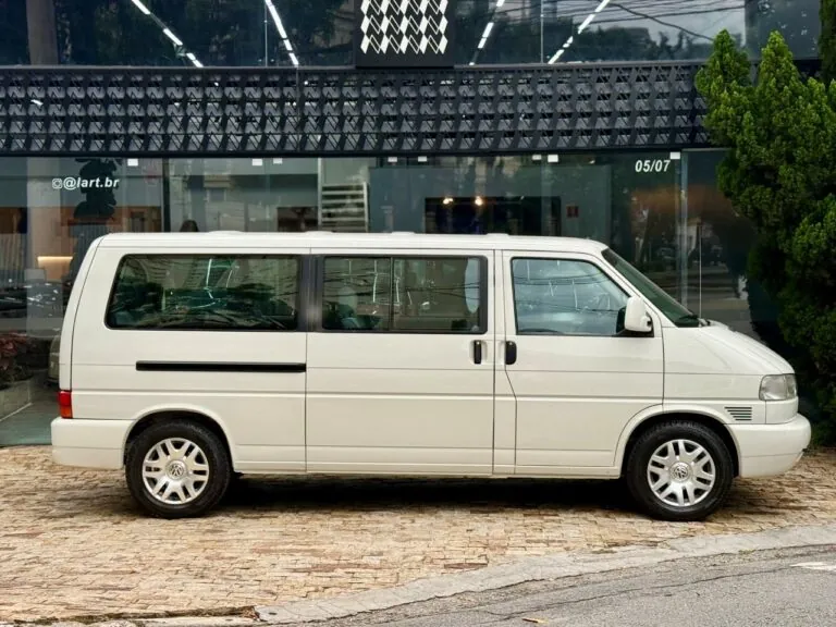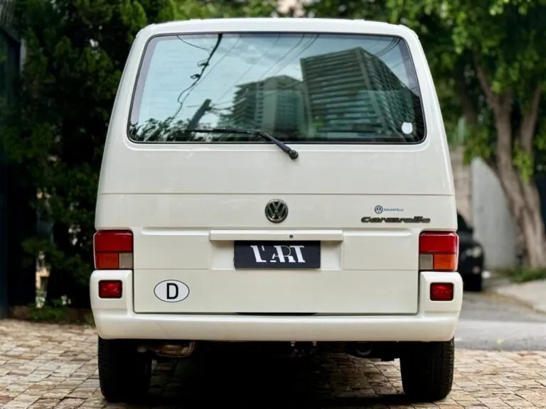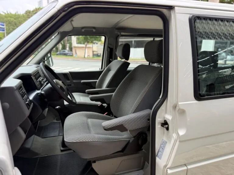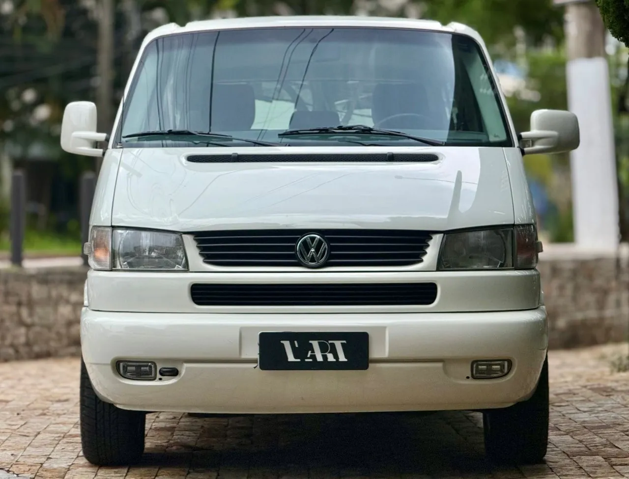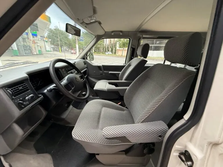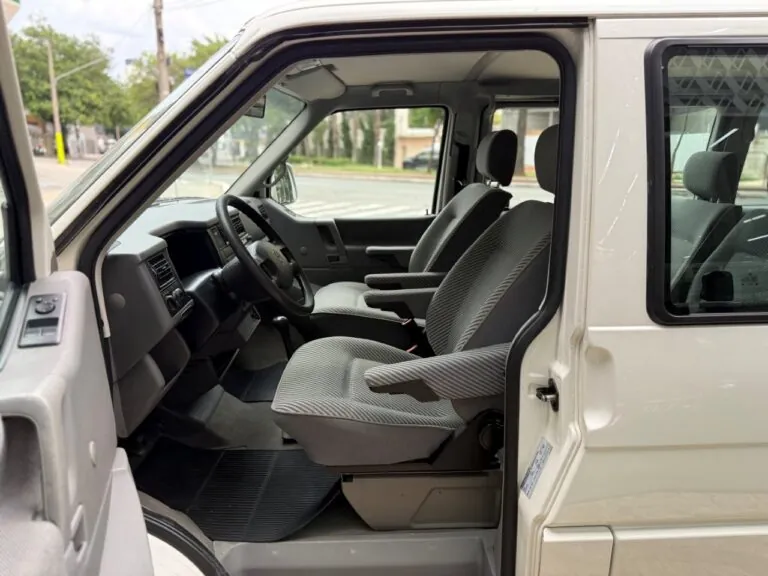Branco Candy com interior em veludo listrado cinza, segundo dono, totalmente original e em excelente estado. Versão executiva e facelift da Eurovan, configurada para 10 lugares em 4 fileiras, com bancos dianteiros individuais e última fileira dobrável. Equipada com motor 2.4 cinco cilindros diesel e câmbio manual de 5 marchas, possui ar-condicionado, direção hidráulica, rádio original Motobras, forração e bancos originais em veludo, faróis com lâmpadas halógenas, rodas aro 16” diamantadas acompanhadas do jogo original com calotas. Com apenas 68 mil km, histórico comprovado desde zero km, retirada na VW Soldatelli no Rio Grande do Sul, totalmente revisada, acompanhada de peças sobressalentes originais, manual do proprietário e chave reserva. Um exemplar raríssimo pelo nível de originalidade, conservação e procedência.